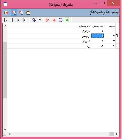 حال تصور کنید می خواهیم "یزد" در ردیف دوم و "پردیس" در ردیف چهارم جا به جا شود ، برای این کار با تغییر کد بخش میتوان این ترتیب را تغییر داد. به این صورت که کد پردیس را ابتدا از 2 به 5 (یک کدی که در سیستم نداریم) تغییر می دهیم سپس کد یزد را 2 می کنیم و مجددا کد پردیس را به 4 تغییر می دهیم