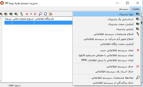 در رابطه با گرفتن Backup از سیستم هدیه نوسا ، لطفا بعد از باز کردن نرم افزار روی منوی سیستم کلیک نمایید و مدیریت هدیه نوسا XP را انتخاب کرده ،بعد ازانتخاب پایگاه مورد نظرتان ، از منوی عملیات تهیه پشتیبان را انتخاب کنید.