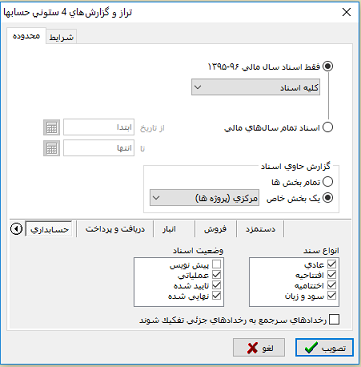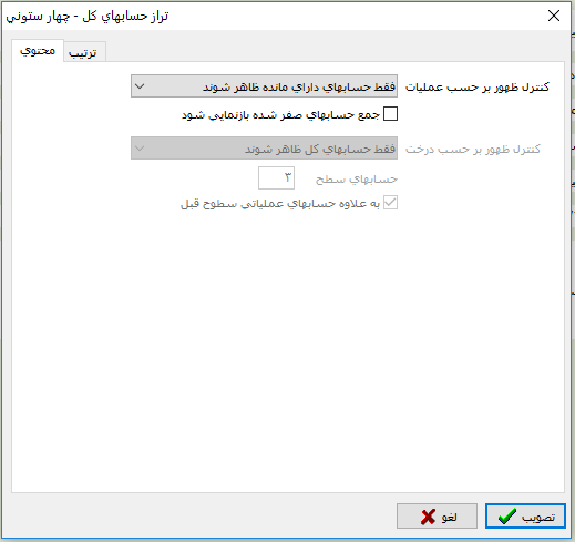 4-بعد از انتخاب نوع گزارش روی نمایش گزارش کلیک می کنیم و صفحه زیر باز می شود ، در این صفحه مثلا می خواهم فقط حساب های دارای مانده در تراز منعکس شوند و جمع حسابهای صفر شده بازنمایی نشوند ، برای تهیه تراز با این شرایط باید تنظیمات این صفحه مانند تصویر زیر باشد.