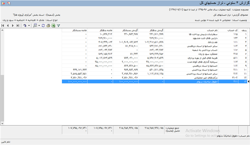 همان طور که در تصویر بالا مشاهده می فرمائید ، حسابهایی که مانده آنها صفر می باشد در گزارش نمایش داده نمی شود و همچنین مانده حسابها در هر دو ستون بدهکار و بستانکار برحسب (کمترین مبلغ به بیشترین مبلغ) مرتب شده اند.