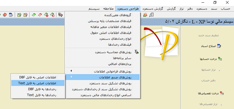برای اینکه بتوانید چنین خروجی از نوسا دریافت کنید در ابتدا یک نوع روش صدور اطلاعات با توجه به فرمت و درخواستهای بانک عامل بسازید. برای انجام این عمل مانند تصویر زیر از تب طراحی دستمزد – روشهای صدور اطلاعات – اطلاعات اصلی به فایل text را انتخاب نمایید