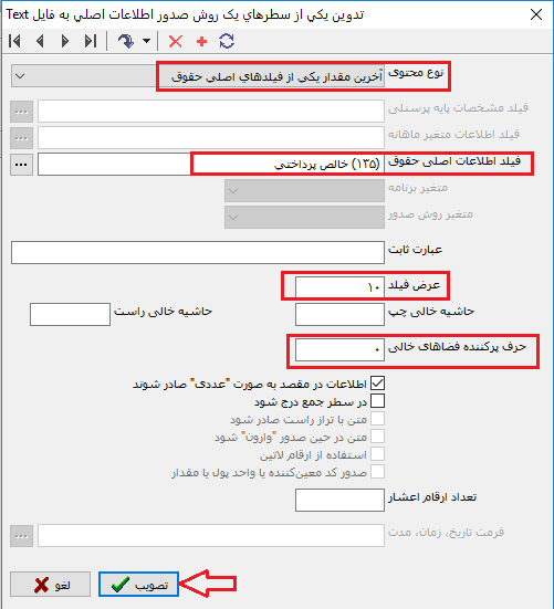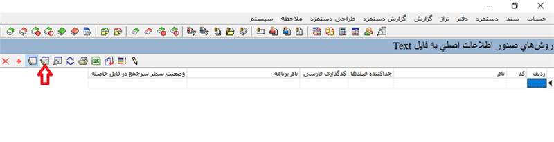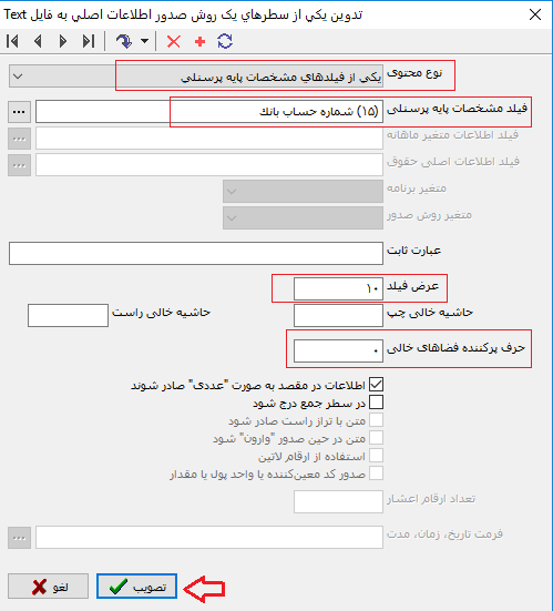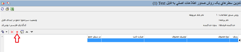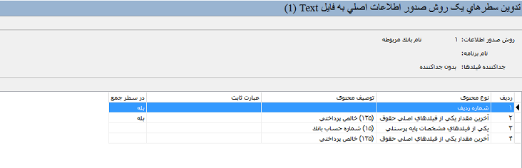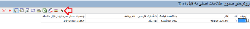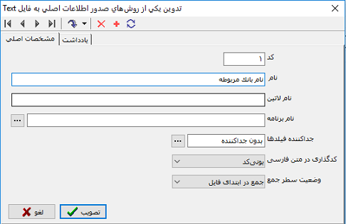 همانگونه که در تصویر مشاهده می نمایید در این پنجره اطلاعاتی از قبیل کد، نام ، نوع جداکننده فیلدها ، نوع کد گذاری در متن فارسی و وضعیت سطر جمع مشخص می گردد. نام را به صورت دلخواه انتخاب نمایید و بقیه فیلدها را با توجه به درخواست بانک مربوطه تکمیل نمائید