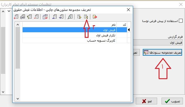 سپس پنجره تعریف فرم چاپی را میبندیم و روی مجموعه ستون دبل کلیک میکنیم. و در پنجره باز شده گزینه فراخوانی تعریف مجموعه ستون از فایل صادره را انتخاب میکنیم.