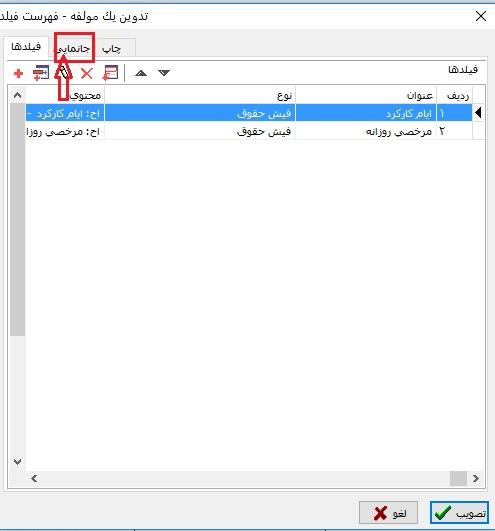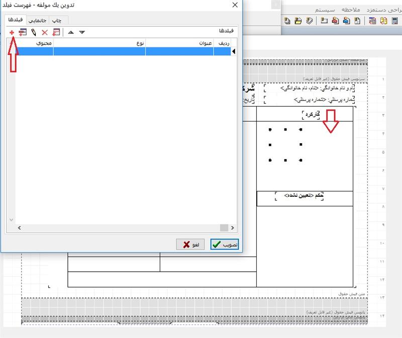 سپس تصویب میکنیم. و به همین ترتیب باقی موارد مربوط به کارکرد که مایل هستید در فیش بیاید را با زدن علامت + و اضافه کردن فیلدها در فرم اضافه میکنیم.درنهایت مطابق شکل زیرروی گزینه جانمایی کلیک میکنیم.
