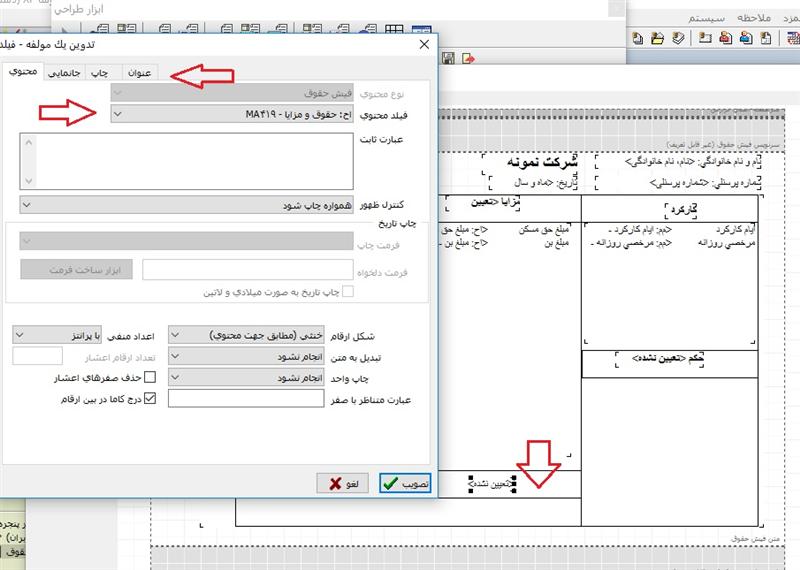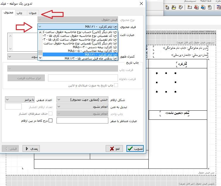در پنجره بعد برای مثال حق مسکن را انتخاب میکنیم در اینجا دقت میکنیم که حتما فیلد "اح" یا "MA" را انتخاب کرده باشیم و بعد از تب عنوان، عنوان دلخواه را پر میکنیم.