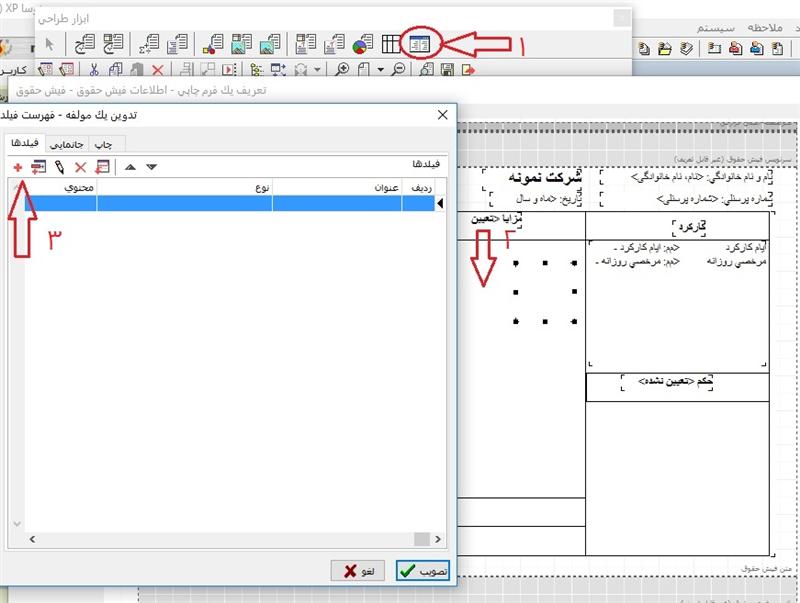 سپس در ادامه پنجره تعریف مجموعه ستون را می بندیم و تعریف فرم چاپی را باز میکنیم و روی فرم "فیش حقوق" دبل کلیک میکنیم. در پنجره بعد مطابق شکل زیر ایجاد مولفه "فهرست فیلد" را می زنیم.و سپس روی فضای خالی پائین قسمت کارکرد کلیک میکنیم.