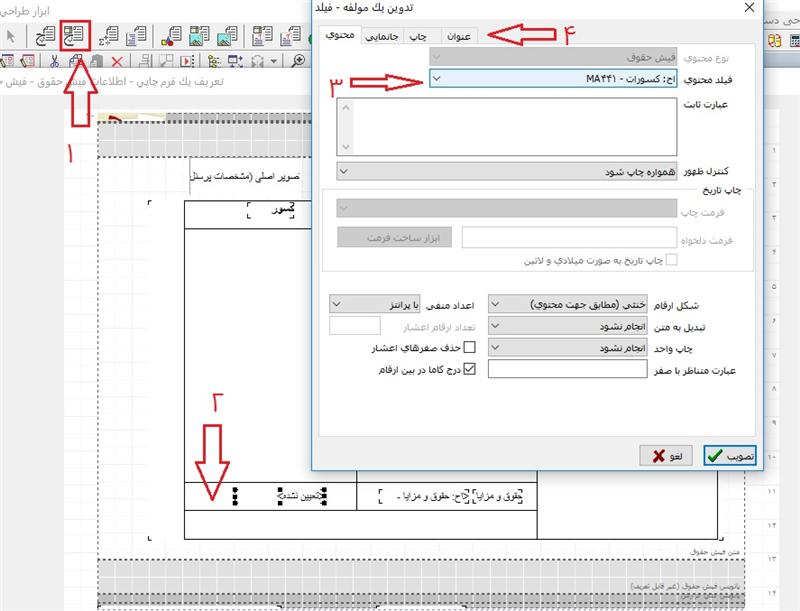 در مرحله بعد مطابق شکل "ایجاد مولفه فیلد" را میزنیم و روی قسمت خالص پرداختی کلیک میکنیم.