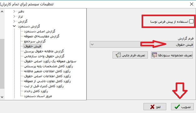 در پنجره بعد مطابق شکل زیر فرم چاپی که قبلا فراخوانی کردیم را به نام "فیش حقوق" انتخاب میکنیم.
