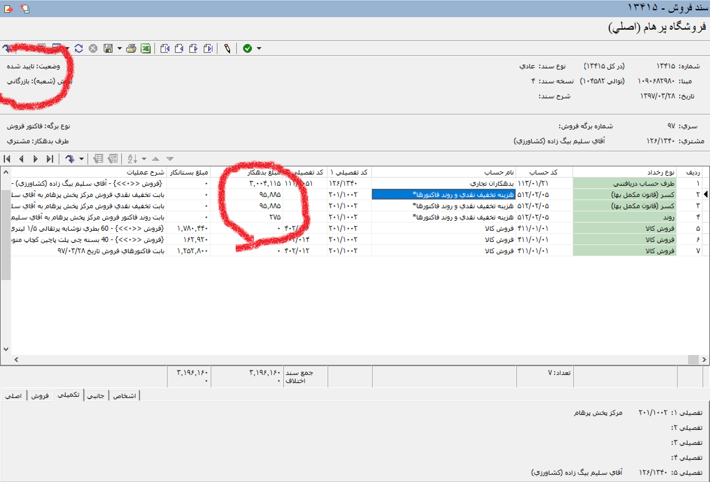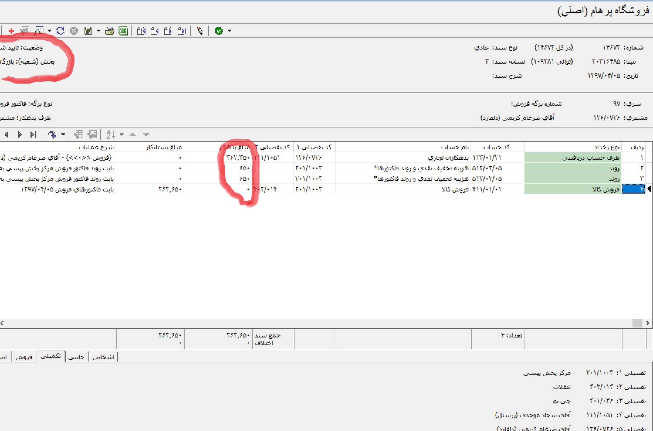 در شرکت شاداب پخش جیرفت به موضوع عجیبی برخورد کرده ایم: در تعدادی از برگه های فروش رخداد کسور و اضافات تکراری وجود دارد و برگه به همین شکل عملیاتی هم شده است. با حسابدار فروش که صحبت کردیم بیان کرد که مدتی است به این مشکل برخورد می کند و هر وقت خودش این موضوع را ببیند آن را اصلاح میکند.
