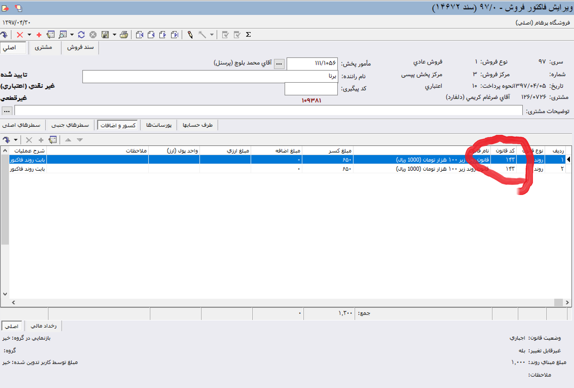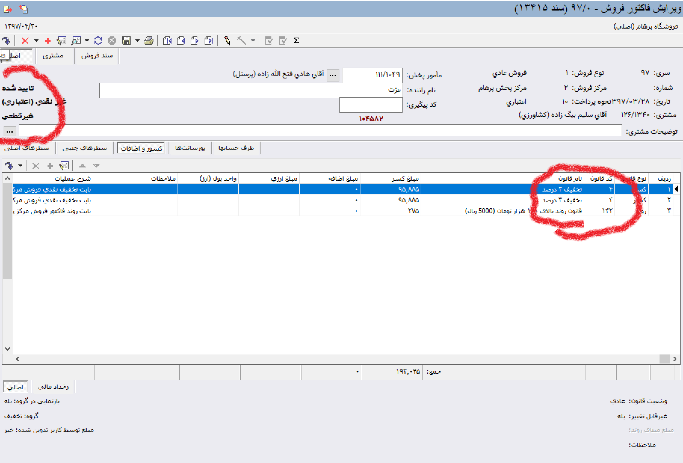 مشکل منحصر به قانون روند نیست، در فاکتور و سند زیر مشاهده می فرمایید که یک قانون تخفیف هم همین مشکل را دارد. باز هم هر چند قانون تخفیف 3 درصد دوبار تکرار شده، اما هر دو دفعه به یک مبلغ است. نکته جالب دیگر این است که در فاکتور ذیل قانون تخفیف تکرار شده اما قانون روند تکرار نشده است.