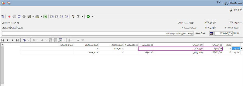 پس از انجام اصلاح یکباره، سند را چک می نماییم که هزینه ماهانه به هزینه آب انتقال داده شده است.