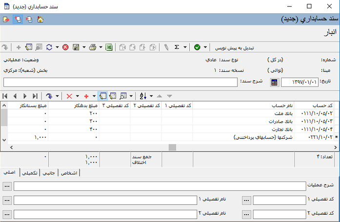 همانطور که در شکل زیر می بینید یک سند حسابداری تنظیم شده است: