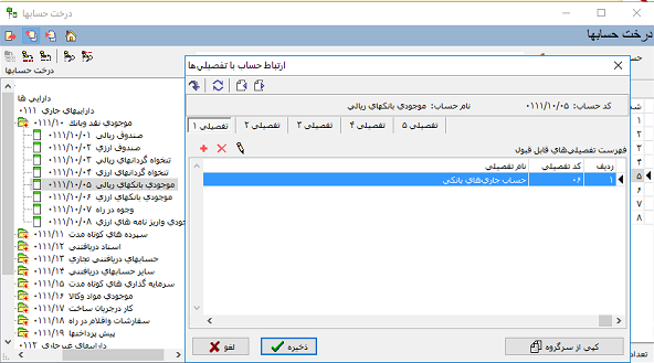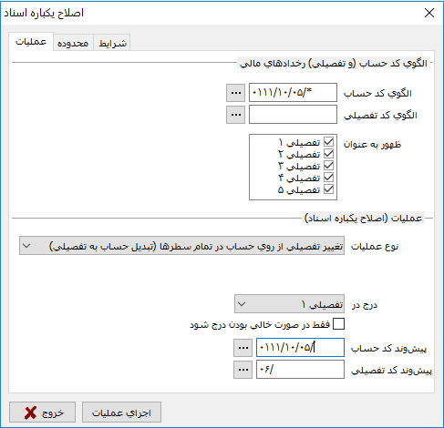 به طور مثال فرض کنید میخواهیم حسابهای عملیاتی زیر گروه */0111/10/05 را به عنوان تفصیلی های عملیاتی زیر گروه تفصیلی */06 تعریف کنیم و تفصیلی ها مزبور را در اسناد، برای الگوی کد حساب مزبور در تفصیلی 1 درج کنیم.
