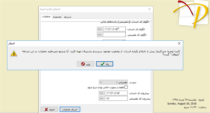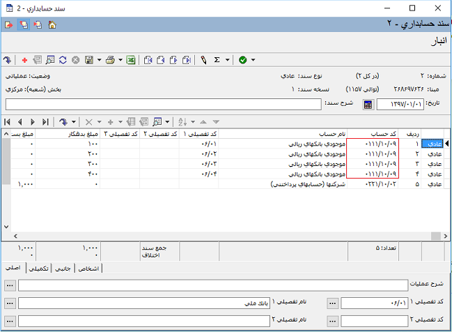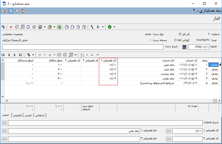 گاها ممکن است بخواهیم بعضی از حسابهای عملیاتی را که در درخت حسابها تعریف کرده ایم با استفاده از امکان "کپی حسابهای عملیاتی به زیر گروه تفصیل انتخاب شده" در درخت تفصیلی ها کپی کنیم. پس از انجام این کار نیاز است که کد اسناد مربوط به حسابهای عملیاتی را که به درخت تفصیلی ها انتقال داده ایم تغییر دهیم.