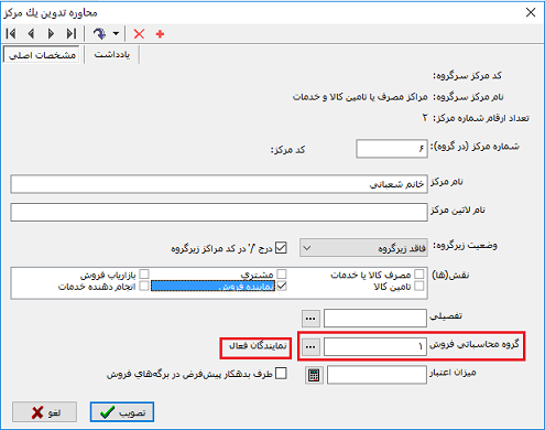 فرض کنید میخواهیم تخفیف 10% برای نمایندگان فعال فروش  خود در نظر بگیریم، برای انجام این کار باید اول راهی برای تفکیک نمایندگان فعال و غیر فعال داشته باشیم که میتوانیم از گروه محاسباتی فروش استفاده کنیم