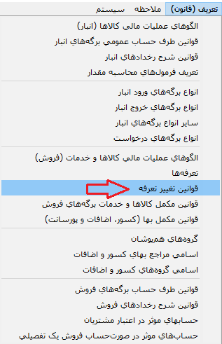 قوانین تغییر تعرفه در واقع فرمولهایی هستند که منجر به ایجاد تغییر در بهای بدست آمده از طریق تعرفه می گردند، به این ترتیب که هنگام محاسبه بهای یک سطر از فاکتور فروش با استفاده از تعرفه میتوان اضافات یا تخفیفات مستقیمی به بهای سطر اعمال نمود . برای ایجاد یک قانون تغییر تعرفه جدید میتوانید همانند تصویر زیر از منوی تعریف (قانون) گزینه مورد نظر را انتخاب کنید