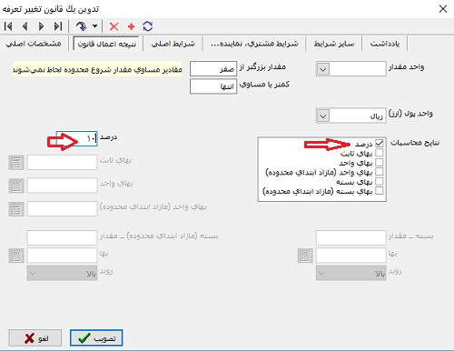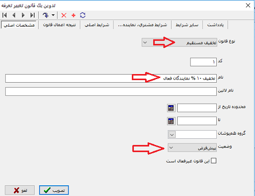 حالا اقدام به ایجاد قانون تغییر تعرفه جدید نمایید. در این مثال یک قانون تغییر تعرفه(تخفیف مستقیم  10 % نمایندگان فعال ) همانند تصویر زیر ایجاد نمایید