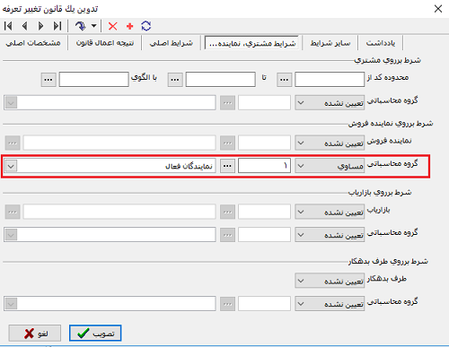 حالا میتوانید در هر یک از قوانین مورد نظرتان در سیستم فروش (تعرفه ها ، قوانین تغییر تعرفه ، قوانین مکمل کالا و خدمات ، کسور و اضافات و پورسانت ها) از شرط گروه محاسباتی (مساوی) یا (مخالف) نمایندگان فعال استفاده نمایید.