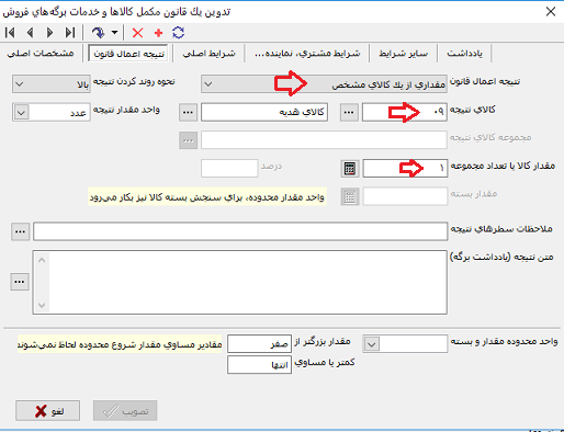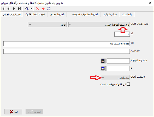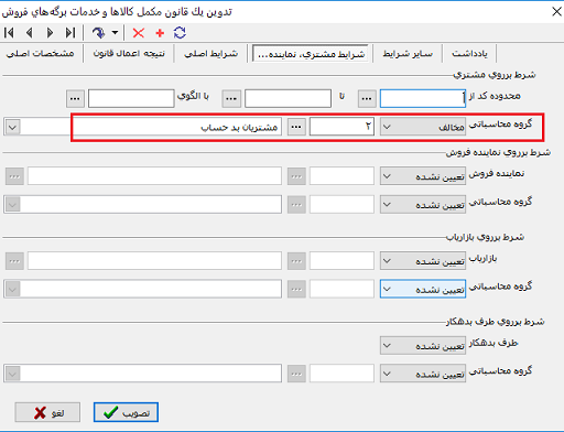 حال یک قانون مکمل کالا و خدمات همانند تصاویر زیر ایجاد کنید و در تب شرایط مشتری،نماینده و....... در قسمت شرط به روی مشتری همانند تصویر زیر گروه محاسباتی را مخالف مشتریان بد حساب  قرار می دهیم .