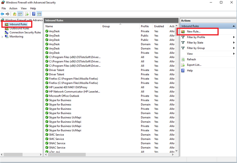 در سمت چپ، گزینه Inbound Rules را انتخاب کرده، سپس در پنجره  Action، گزینه ...New rule را انتخاب نمایید.