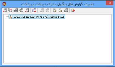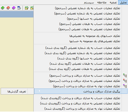 از منوی تحلیل  =>  پیگیری مدارک دریافت و پرداخت  => تعریف گزارش ها را انتخاب میکنیم.