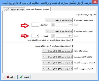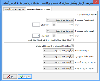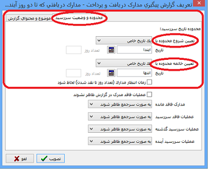 در تب "محدوده و وضعیت سر رسید" در قسمت بالای این پنجره یک محدوده تاریخ سررسید داریم که یکی برای شروع تاریخ سررسید و یکی پایان تاریخ سررسید می باشد.