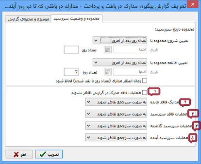 مثلا اگر وضعیت نقد شدن چکی که تاریخ سررسیدش 5 بهمن 97 می باشد را 5 روز در نظر گرفته باشیم و در این گزارش نیز چک باکس "زمان انتظار مدارک (تعداد روز تا نقد شدن) لحاظ شود" را زده باشیم تاریخ 10 بهمن برای این چک لحاظ می شود.