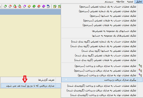 حال برای گرفتن گزارش به مانند شکل زیر از منوی تحلیل => پیگیری مدارک دریافت و پرداخت => گزارش مورد نظر را انتخاب میکنیم.