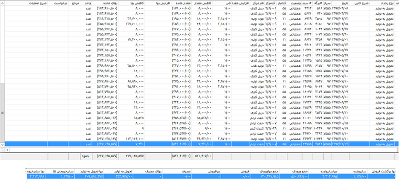 به جز مقدار، بها هم مغایرت دارد. لطفا نحوه‌ی تعریف ستون تحویل به تولید (و بهای تحویل به تولید) در فرم گزارش گردش را بررسی فرمایید. شاید به جز نوع رخداد شرایط دیگری هم در آن لحاظ شده باشد - یا انواع رخداد ورود دیگری هم سهوا (یا عمدا - مثل برگشت از تحویل به تولید) در آن تعریف شده باشد. اگر چنین باشد در اخذ و مقایسه‌ی ریزعملیات باید همه‌ی مواردی که در تعریف ستون داشته‌اید را نیز لحاظ نمایید. اگر مغایرت از این نیست باید داده‌ها توسط همکاران بنده در بخش پشتیبانی مورد بررسی بیشتر قرار گیرند.