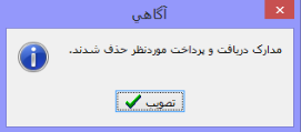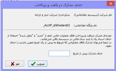 محاوره حذف مدارک دریافت و پرداخت را مشاهده میکنید که حاوی یکسری اطلاعات از پایگاه اطلاعاتی مربوطه است . در این محاوره ما میتوانیم با تعیین تاریخ مشخص کنیم که مدارک پیش از چه تاریخی حذف شوند و تصویب نماییم