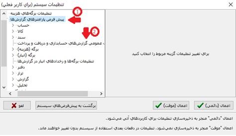 با انجام این کار پنجره ای مطابق شکل زیر باز می شود. در پنجره باز شده پیش فرض پارامترهای گزارش ها و سپس تنظیمات عمومی گزارش های حسابداری و دریافت و پرداخت را انتخاب میکنیم: