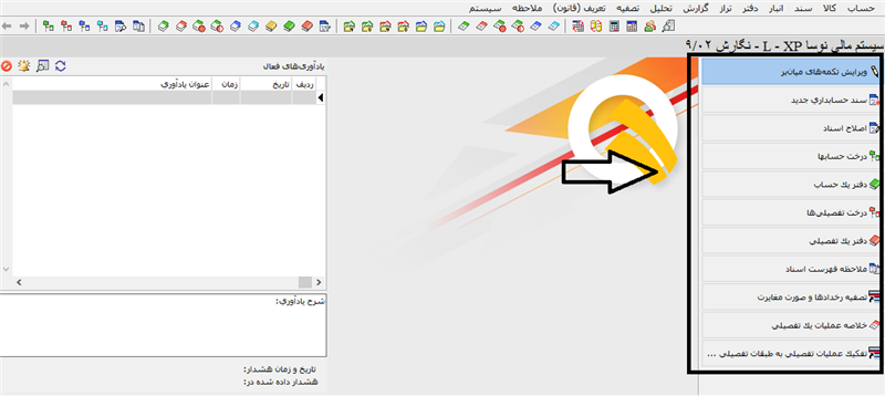 همانطور که در شکل دیده می‌شود، در نوار عمودی سمت راست نرم افزار، تکمه‌های میان‌بر قرار دارند. که هر یک از این تکمه‌ها متناظر با یکی از آیتم‌های منوی اصلی سیستم می باشند.