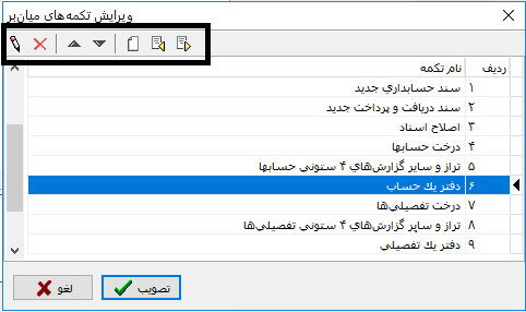 برای افزودن تکمه‌ی میان‌بر جدید ، یکی از آیتم‌های منو را Drag میکنیم و در نوار عمودی تکمه‌های میان‌بر Drop  میکنیم. عنوان و تصویر آیتم منو هم در تکمه‌ی میان‌بر منعکس می‌شود. (مانند آیتم عملیات بچ کالا در تصویر زیر)