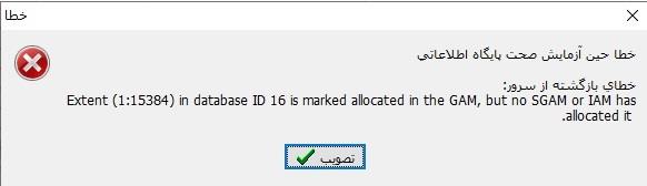 موقع آزمایش صحت پایگاه اطلاعاتی خطای زیر را دریافت کردم (  allocated  in the GAM  .برای تهیه پشتیبان و همچنین آزمایش صحت پشتیبان هیچ مشکلی در سیستم شناسایی نمیشود.ممنون میشم از شما که من را برای رفع این اشکال راهنمایی بفرمایید .(ویندوز : ویندوز 10 - SQL 2017 EXPRESS -  نسخه نوسا : 902)