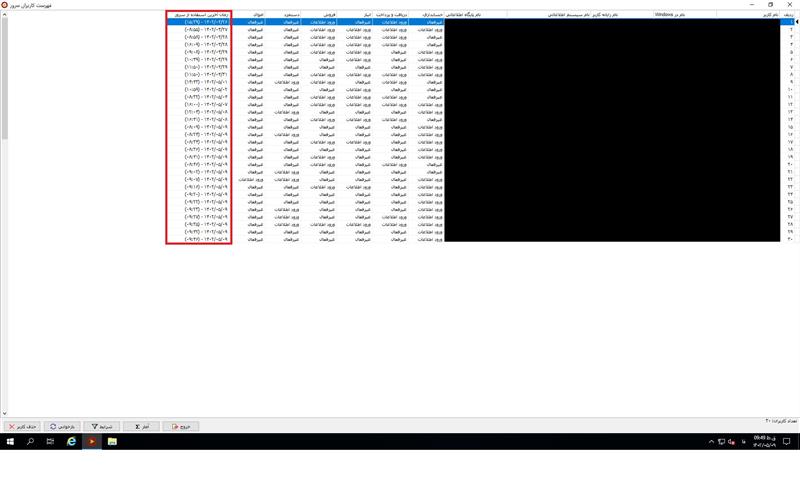 3. در سیستم شما در حالت ماکسیمایز تمام ستونها نمایش داده میشود ولی در سیستم بنده در این حالت هم عرض ستونها زیاد است و همه ستونها پیدا نیست. در نتیجه برای دیدن همزمان نام کاربر و آخرین زمان استفاده باید عرض ستونها را کم کنم. (به نظرم اگر قرار است ترتیب ستونها بر اساس اولویت باشد ستون آخرین زمان استفاده باید جلوتر باشد که بدون ماکسیمایز شدن هم پیدا باشد)