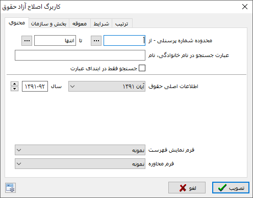 "ماه" مورد نظر در این محاوره تعیین میشود. همهی پرسنلی که از قبل در آن ماه، رکورد حقوق "دارای" اطلاعات داشته باشند به صورت پیشفرض در کاربرگ احضار میشوند. با این همه، همانند موارد مشابه قبلی، امکان تعیین محدوده شماره پرسنلی یا جستجو نیز در کاربرگ تعبیه شده است. به جز این از شرایط و ترتیب هم میتوان استفاده کرد. بقیهی اجزاء این محاوره دقیقا همانند قبل هستند.