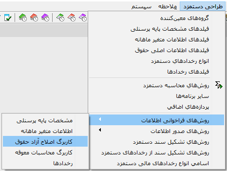 برای فراخوانی اطلاعات از فایلهای Text یا DBF در این کاربرگ نیاز به روشهای فراخوانی اختصاصی داریم – چرا که فیلدهای مقصد (آنها که قرار است در فراخوانی اصلاح شوند) در این کاربرد نسبت به کاربردهای مشابه قبلی متفاوت هستند: فیلدهای قابل اصلاح آزاد از اطلاعات اصلی حقوق. تعریف این روشها با یک گزینه از منوی اصلی سیستم، به صورتی که در شکل زیر نشان داده شده است، انجام میشود.