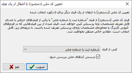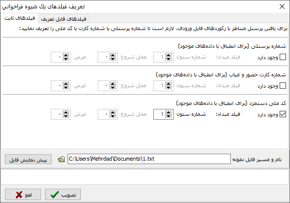 تعریف روش فراخوانی، بسیار مشابه قبل انجام میشود. در اینجا هم انطباق رکوردهای فراخوانی شده با دادههای موجود، با شمارهی پرسنلی، شمارهی کارت حضور و غیاب و فیلد جدید "کد ملی (دستمزد)" میسر است. تنها تفاوت، در انتخاب فیلد مقصد است: در اینجا حتما باید از بین فیلدهای اطلاعات اصلی حقوق که قابل اصلاح آزاد باشند انتخاب شود.